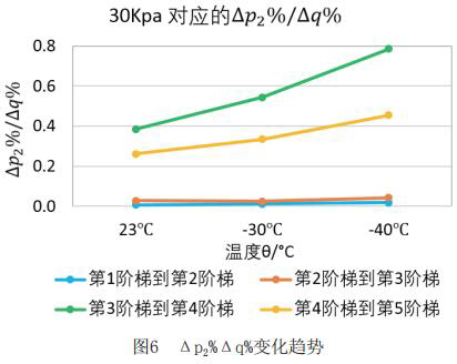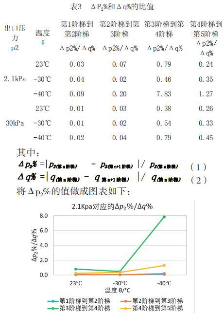 為了更直觀嚴(yán)謹(jǐn)?shù)膶Ρ让總€(gè)階段響應(yīng)速度的不同,對原始數(shù)據(jù)進(jìn)行處理,得到如下表格2和表格3。將△p2%/△q%作為響應(yīng)速度的直觀量化表達(dá),若△p2%/△q%的值大,說明單位流量變化照成的出口壓力變化大,即說明電磁流量計(jì)響應(yīng)相對較慢,反之亦然。