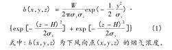 式中: b(x,y,z) = w × e(x,y,z),其中 e(x,y,z) 為二氧化硫濃度與循環(huán)流化床火炬氣流量計煙氣排放源煙氣強度的比例系數(shù);f 為平均風速,m/s; w 為地面空氣內(nèi)煙氣排放強度;σ x 為橫向擴散系數(shù)受環(huán)境穩(wěn)定度與下風向距離因素的影響程度。式(3)中描述的是基于時間變化的循環(huán)流化床火炬氣流量計煙氣排放源煙氣排放強度計算模型。
