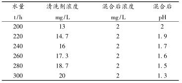 (2)加酸期間附企水處理公司人員負責每0.5h在高架水槽處化驗污環(huán)水pH值,每2h監(jiān)測一次高架水槽內掛片腐蝕情況,將化驗結果告知燃氣崗位人員,崗位職工負責記錄。當pH小于6時,附企給水人員在高架水槽處加入堿液進行調整,同時根據(jù)洗滌塔循環(huán)水量變換情況調整清洗劑濃度見表3。