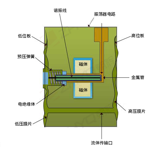 由磁場(chǎng)驅(qū)動(dòng)的振蕩器電路會(huì)導(dǎo)致導(dǎo)線以其共振頻率振蕩。導(dǎo)線的一側(cè)牢固地固定到靜態(tài)部件,而另一側(cè)則連接到膜片。彈簧使電線預(yù)緊。由于過程壓力對(duì)隔膜的影響,金屬絲將在壓力升高時(shí)拉伸,而在壓力降低時(shí)收縮。共振頻率將相應(yīng)地增加或減少。數(shù)字計(jì)數(shù)器測(cè)量諧振頻率的變化,并將其信號(hào)傳遞給微芯片,該微芯片還處理線性化補(bǔ)償和溫度補(bǔ)償。