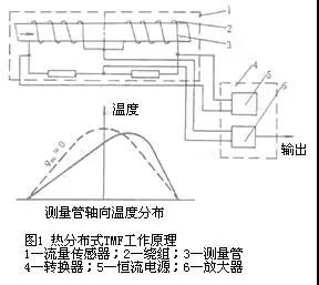 熱分布式tmf的工作原理如圖1所示,薄壁測量管3外壁繞著兩組兼作加熱器和檢測元件的繞組2,組成惠斯登電橋,由恒流電源5供給恒定熱量,通過線圈絕緣層、管壁、流體邊界層傳導(dǎo)熱量給管內(nèi)流體。邊界層內(nèi)熱的傳遞可以看作熱傳導(dǎo)方式實(shí)現(xiàn)的。在流量為零時,測量管上的溫度分布如圖下部虛線所示,相對于測量管中心的上下游是對稱的,由線圈和電阻組成的電橋處于平衡狀態(tài);當(dāng)流體流動時,流體將上游的部分熱量帶給下游,導(dǎo)致溫度分布變化如實(shí)線所示,由電橋測出兩組線圈電阻值的變化,求得兩組線圈平均溫度差δt。便可按下式導(dǎo)出質(zhì)量流量qm,即