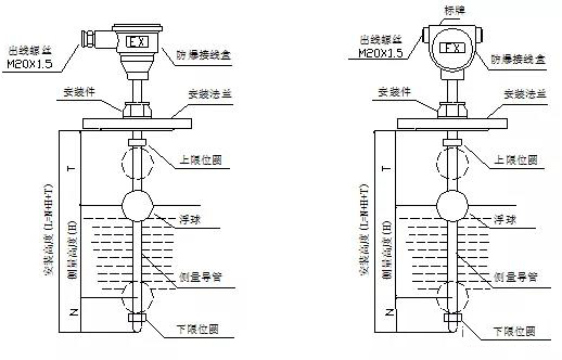 頂裝式浮球液位計(jì)是一種工業(yè)生產(chǎn)中普遍在使用的液位測量儀表,其安裝方便靈活,具有良好的適應(yīng)性,法蘭式和支架式安裝都可進(jìn)行,可適應(yīng)不同的工況條件。浮球液位計(jì)是以磁浮球?yàn)闇y量元件,通過磁耦合作用,致使傳感器內(nèi)電阻產(chǎn)生線性變化,再通過智能轉(zhuǎn)換器將電阻變化轉(zhuǎn)換成4~20mA標(biāo)準(zhǔn)電流信號(hào)傳輸,特殊訂制的型號(hào)亦可以疊加HART協(xié)議的信號(hào),*終能液晶方式顯示。據(jù)變送器與顯示器的不同型號(hào),可以現(xiàn)場顯示液位的百分比、4~20mA電流及液位值,此遠(yuǎn)傳信號(hào)可以遠(yuǎn)傳供給控制室,以實(shí)現(xiàn)液位的自動(dòng)檢測、控制和記錄。頂裝式浮球液位計(jì)適用于石油、化工、電力、輕工及醫(yī)藥等行業(yè)污水處理及各類常壓和承壓容器內(nèi)介質(zhì)液位的測量,是測量各類貯罐、地下貯槽的*為理想的液位計(jì)產(chǎn)品。