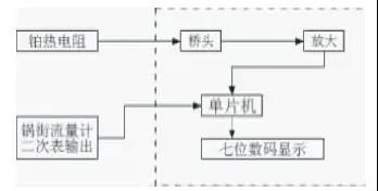 要想得到準確的流量數(shù)據(jù),就必須不斷地在線檢測出運行工況下的溫度,進行溫度補償。安裝鍋街流量計的同時配套使用的DTB液流量計溫度補償器。DTB 液氨流量計溫度補償器安裝電原理方框圖(如圖1),其中虛線框內(nèi)為DTB溫度補償器部分。