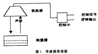 常見的液位傳感器有磁浮筒式、壓力式等,磁浮筒式傳感器要安裝在被測介質(zhì)中,長時間使用易被腐蝕,而壓力傳感器輸出線性較差且成本較高。超聲波傳感器的特點是使用時與液面脫離接觸,無腐蝕問題,且價格低廉。超聲波傳感器由控制卡及換能器構成,如圖I。