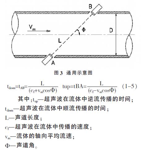 2、超聲流量計以測量超聲波在流動介質中傳播的時間與流量的關系為原理。通常認為超聲波在流體中的實際傳播速度是由介質靜止狀態(tài)下超聲波的傳播速度cf和流體軸向平均流速vm在超聲波傳播方向上的分量組成。如圖,順流和逆流傳播時間與各量之間的關系是