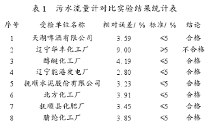 根據(jù)化工污水流量計(jì)選型的校驗(yàn)標(biāo)準(zhǔn),撫順市安裝的化工污水流量計(jì)選型運(yùn)行比較正常可做對(duì)比試驗(yàn)的有14臺(tái),對(duì)這14臺(tái)流量計(jì)分別進(jìn)行了對(duì)比試驗(yàn)。測(cè)試方法是采用標(biāo)準(zhǔn)儀器對(duì)所監(jiān)測(cè)的流量計(jì)進(jìn)行8h的連續(xù)平行監(jiān)測(cè),從試驗(yàn)結(jié)果中選出被檢流量計(jì)*大流量范圍的五點(diǎn)對(duì)比數(shù)據(jù)和累計(jì)流量對(duì)比結(jié)果,相對(duì)誤差小于5%的為合格。此次實(shí)際測(cè)試的有:撫順縣化肥廠、北方化工廠、撫順?biāo)喙煞萦邢薰?、遼寧能港發(fā)電廠、醇醚化工廠、遼寧華豐化工廠、天湖啤酒有限公司、腈綸化工廠8家企業(yè)。飛利鋁材、汽車(chē)鋁輪轂、老虎臺(tái)礦、石油一廠新廠因?yàn)闊o(wú)水未測(cè)試,石油二廠新排污口、乙烯化工廠因?yàn)槿鄙倭髁坑?jì)廠方配合未能測(cè)試。測(cè)試結(jié)果除華豐化工廠流量計(jì)相對(duì)誤差大于5%不合格外,其他均合格,見(jiàn)表1。